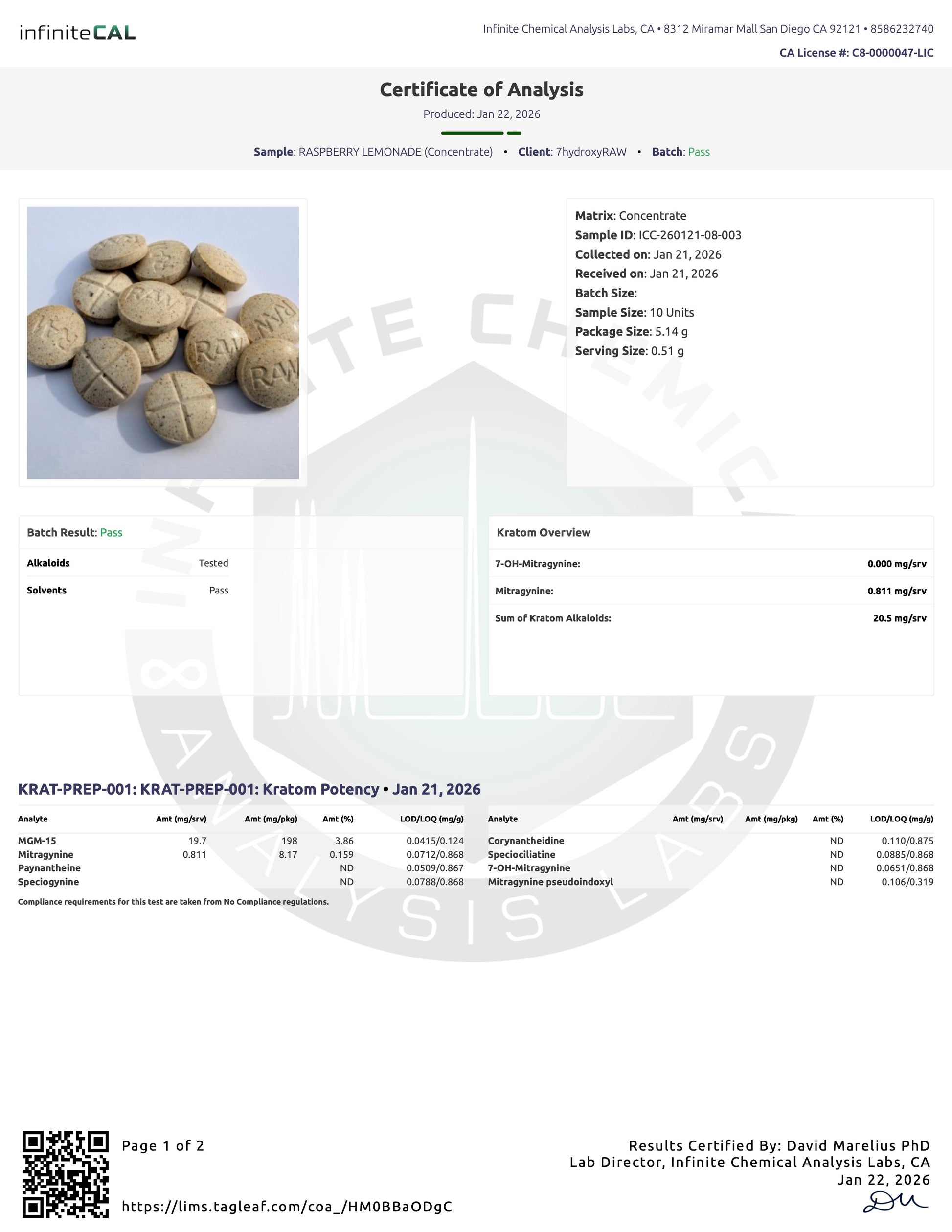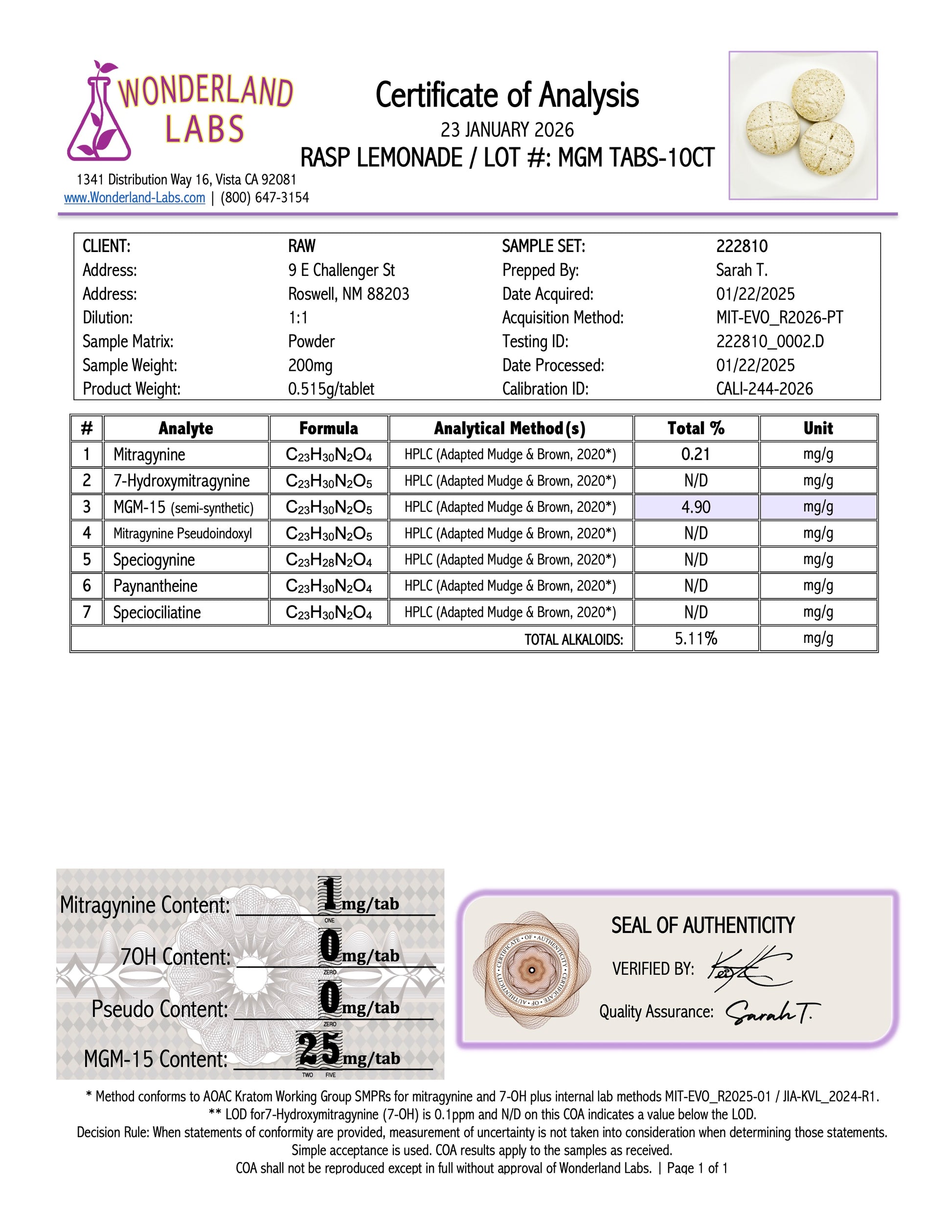 RASPBERRY LEMONADE - 20MG MGM-15 TABS - (NO 7-OH)