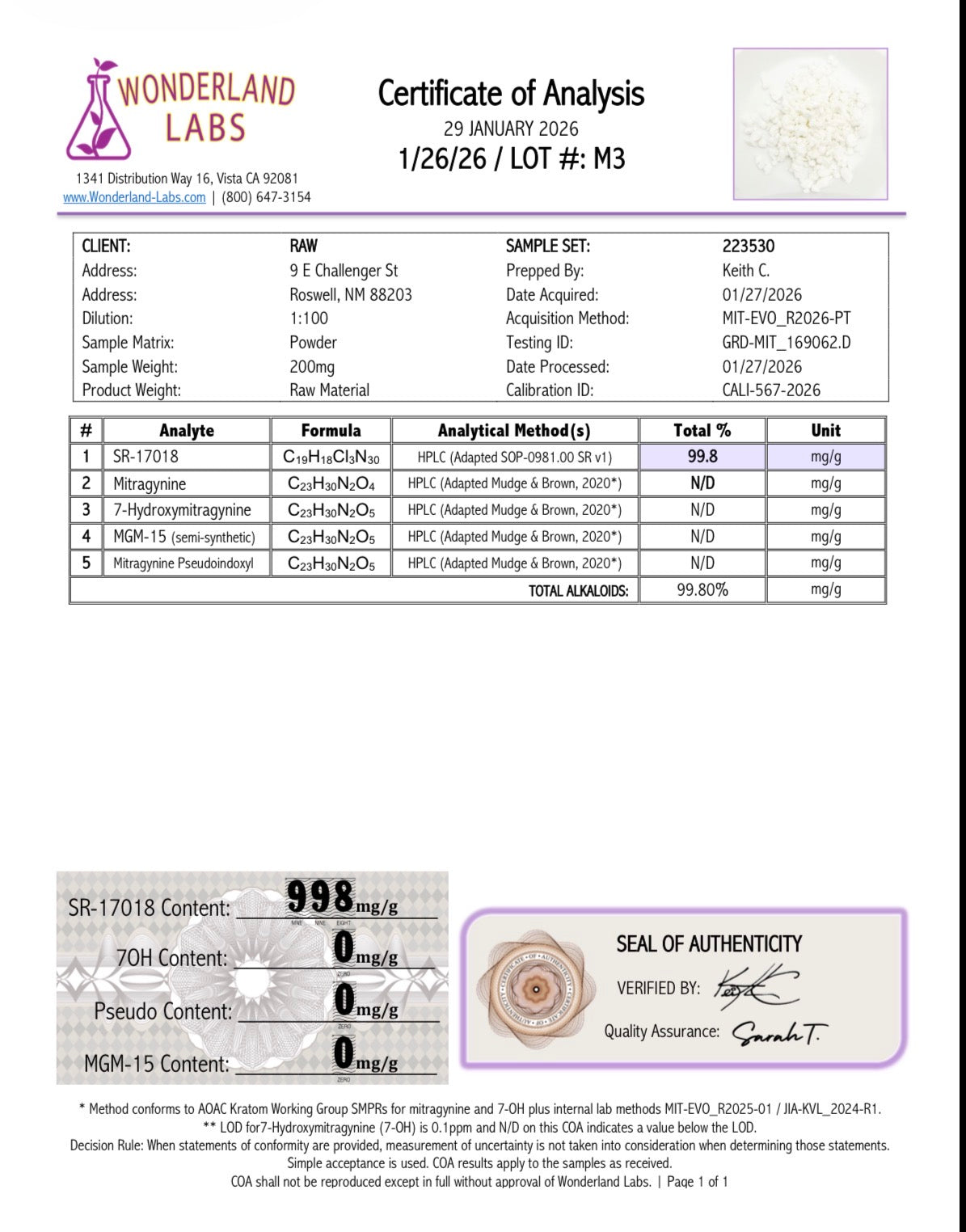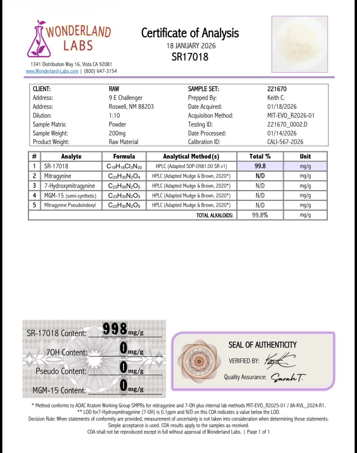 SR-17018 is supplied as a raw material and independently verified through third-party laboratory analysis for identity and purity. A Certificate of Analysis is provided for reference.