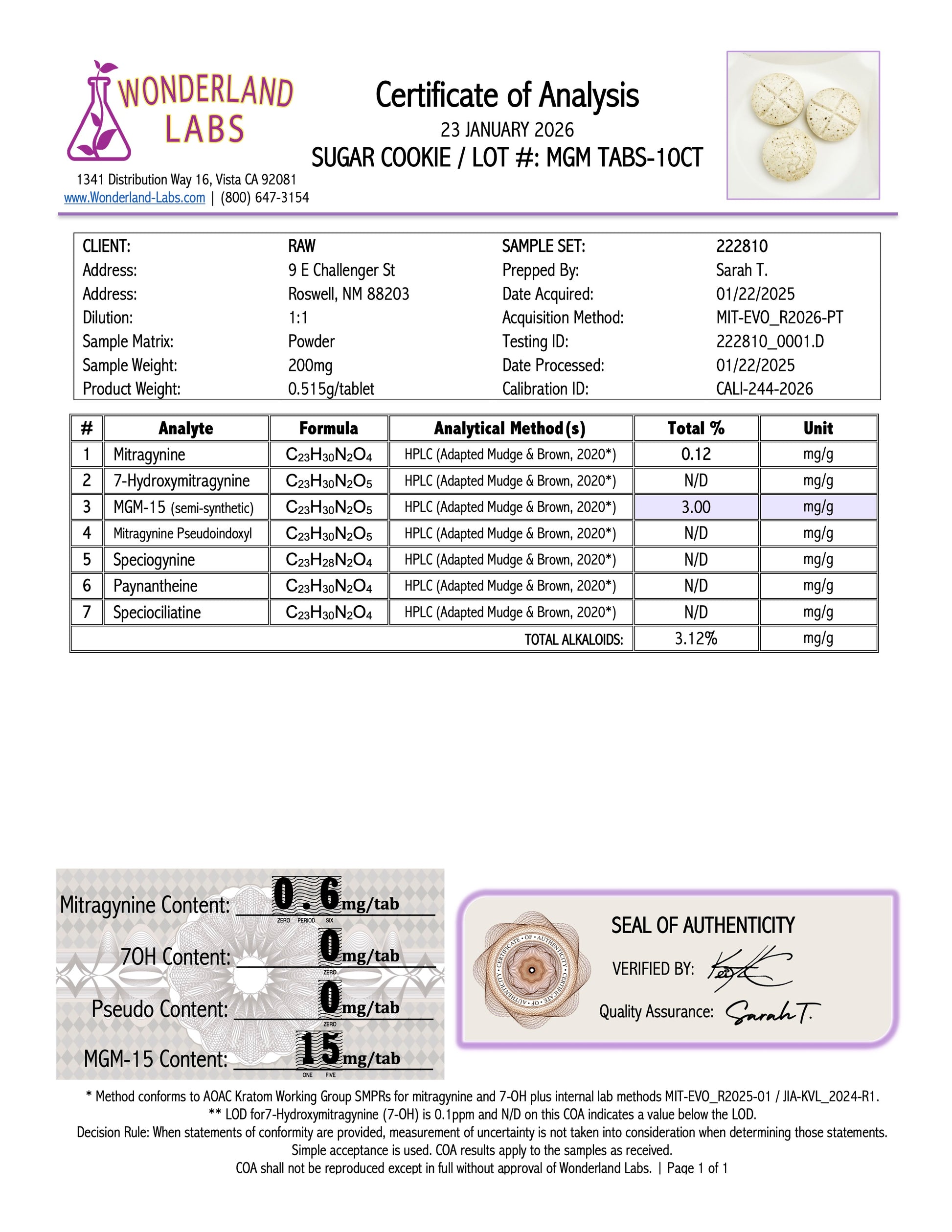 SUGAR COOKIE - 12.7MG MGM-15 TABS (NO 7-OH)